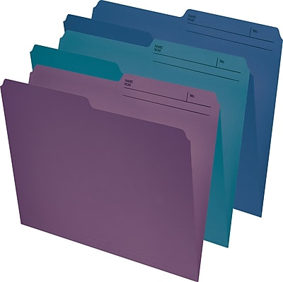 Business source 1/3-cut colored interior file folders letter 8 1/2" x 11" sheet size 1/3 tab cut top tab location assorted position tab position 11 pt. folder thickness stock purple recycled 100 / box. Interiorfolders are ideal for use with hanging folders. folders are designed to separate groups of papers inside a hanging folder or to transfer papers from file to desk. slightly shorter than a standard file, the folders wont obscure the hanging folder tab. lighter interior colors help prevent misfiles. Pendaflex interior file folders, 1/3-cut tabs, letter size, burgundy, 100/box letter 1/3 tab cut tabs in assorted positions burgundy 100/ box free shipping orders $45+.